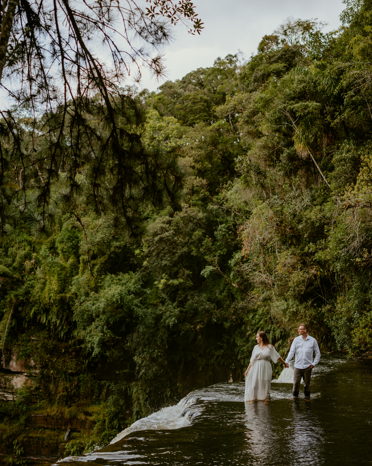 Em meio à natureza exuberante de Rio dos Cedros, na encantadora Cachoeira Formosa, caminhamos juntos por cenários que pareciam ter sido desenhados para esse capítulo da história deles. A água correndo suave pela queda da cachoeira, o verde intenso da mata ao redor, os campos abertos e a tranquilidade do lugar criaram o cenário perfeito para registrar algo que vai muito além de fotos: a essência de um casal prestes a viver um dos dias mais importantes da vida.