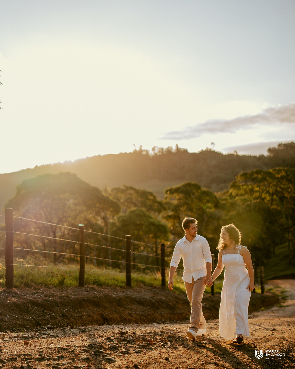 Casal caminhando em estrada rural durante ensaio pré-wedding em Rio dos Cedros, com luz dourada e cenário campestre, inspiração para ensaios na Barragem de Palmeiras, Rio Bonito e região.